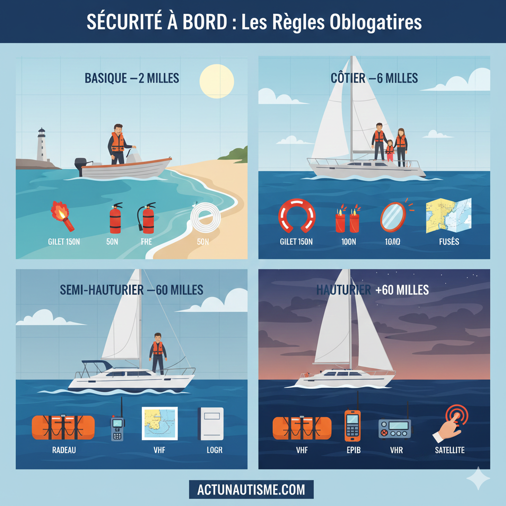 Réglementation maritimeÊtes-vous en règle pour votre prochaine sortie en mer ? Découvrez tout l'équipement de sécurité obligatoire selon votre zone de navigation.